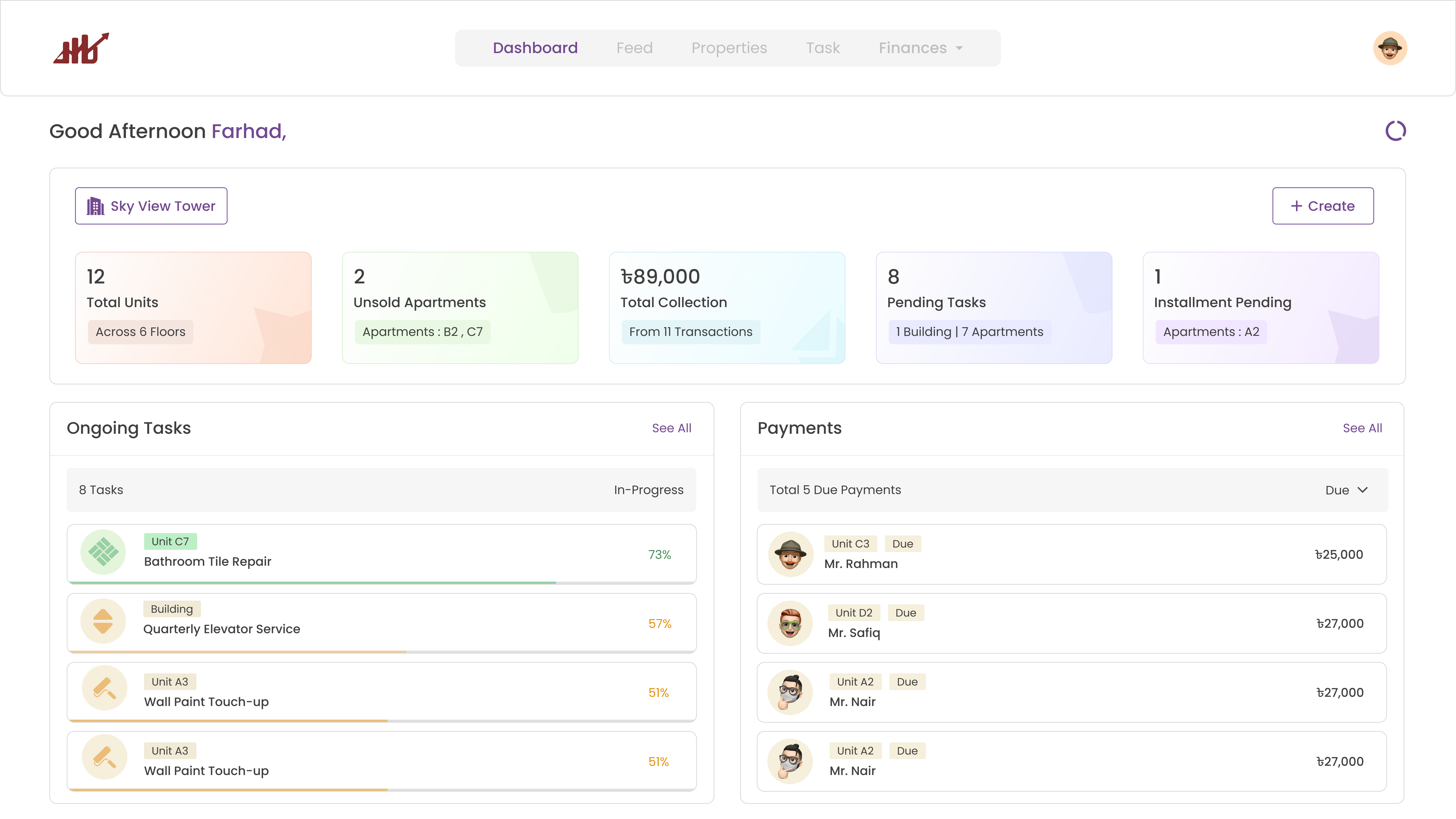 A high-density dashboard for project health and financials. Monitor sales, collections, and task progress across every site in real-time.