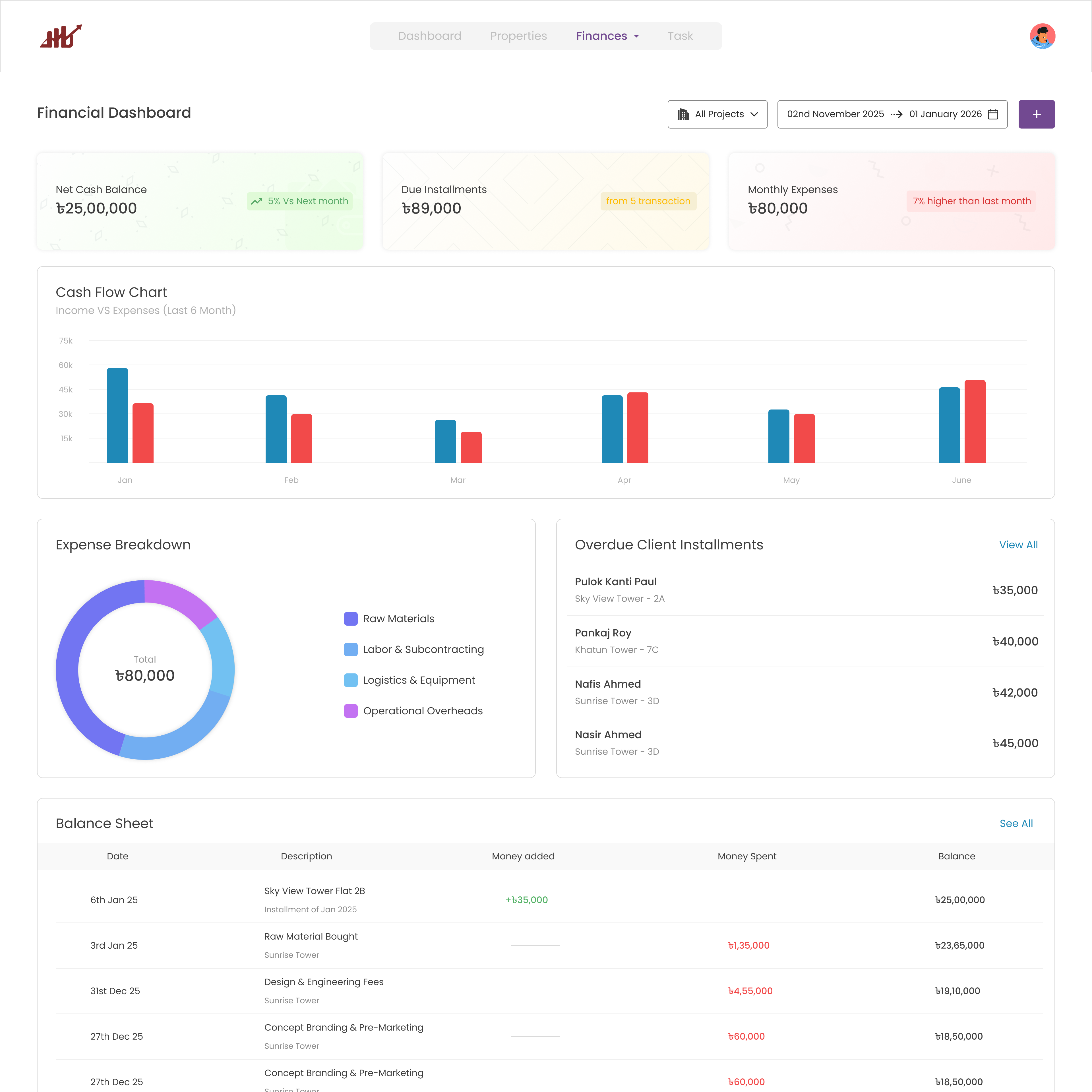 Real-time liquidity control. Sync site expenses with client payments to maintain an automated balance sheet and catch overdue installments before they hit the bottom line.