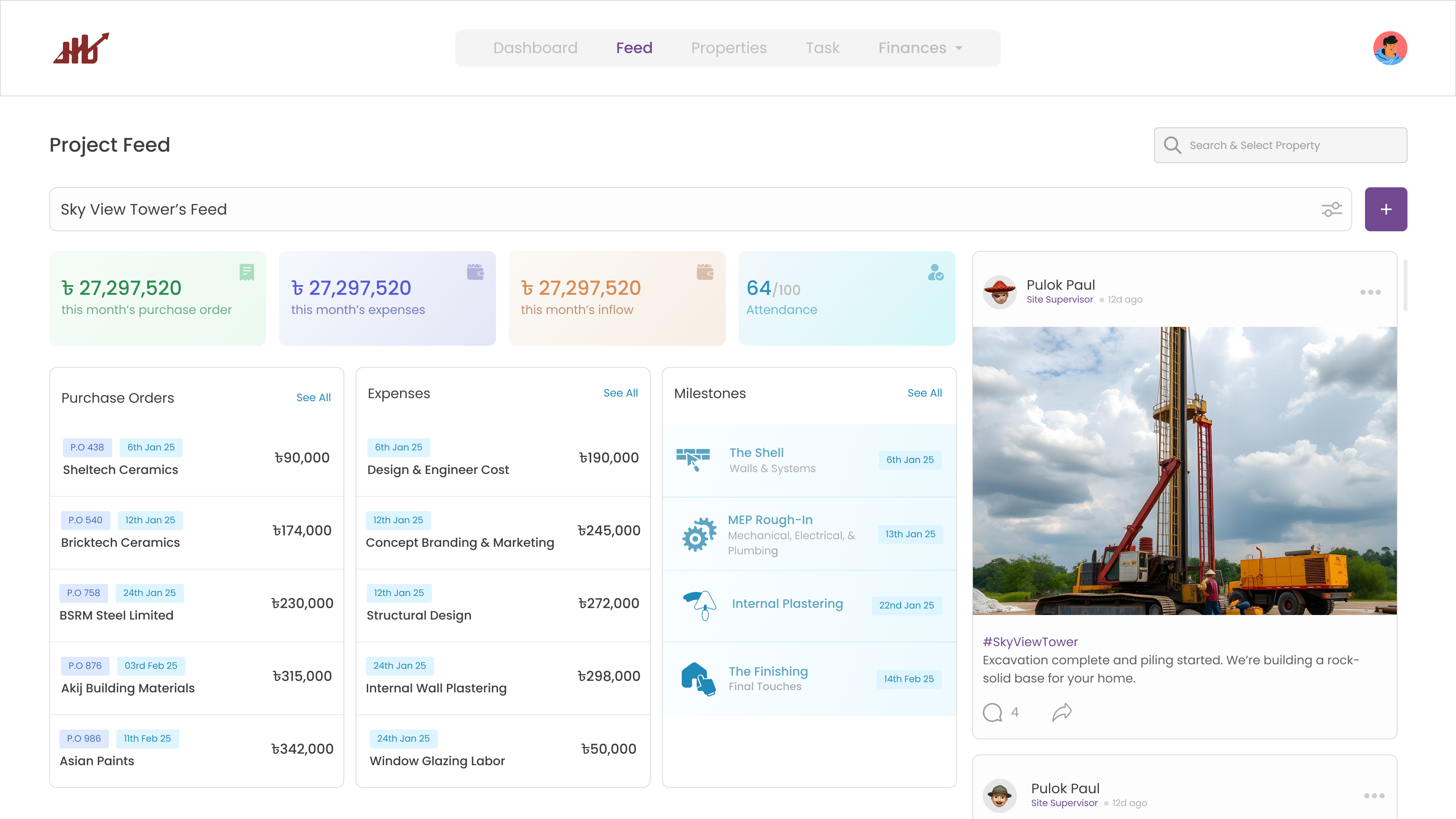 Verify every Taka with visual proof. This interface bridges the gap between financial outflows and physical progress, allowing leadership to monitor live site feeds alongside purchase orders, expenses, and attendance in a single, unified view.